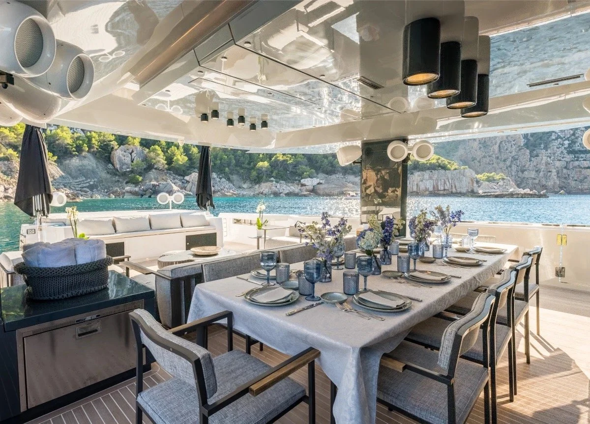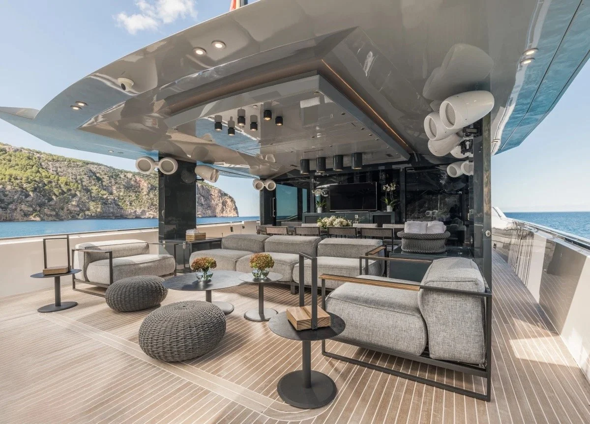 Su diseño exterior, caracterizado por líneas rectas y amplios ventanales, maximiza la conexión con el entorno. Los espacios de cubierta son amplios y versátiles, con terrazas abiertas, zonas de comedor al aire libre y amplios soláriums que invitan a relajarse bajo el sol o disfrutar de una cena frente al mar.