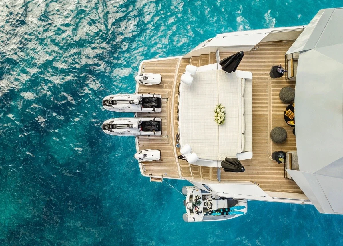 A bordo, los invitados disponen de una amplia selección de juguetes náuticos, que incluye una lancha Williams TurboJet 520 (2023), moto de agua Yamaha SuperJet, dos Seabob F5S, dos E-Foil, paddle boards, wakeboard, esquís acuáticos y equipo de snorkel, ideales para disfrutar plenamente del mar.