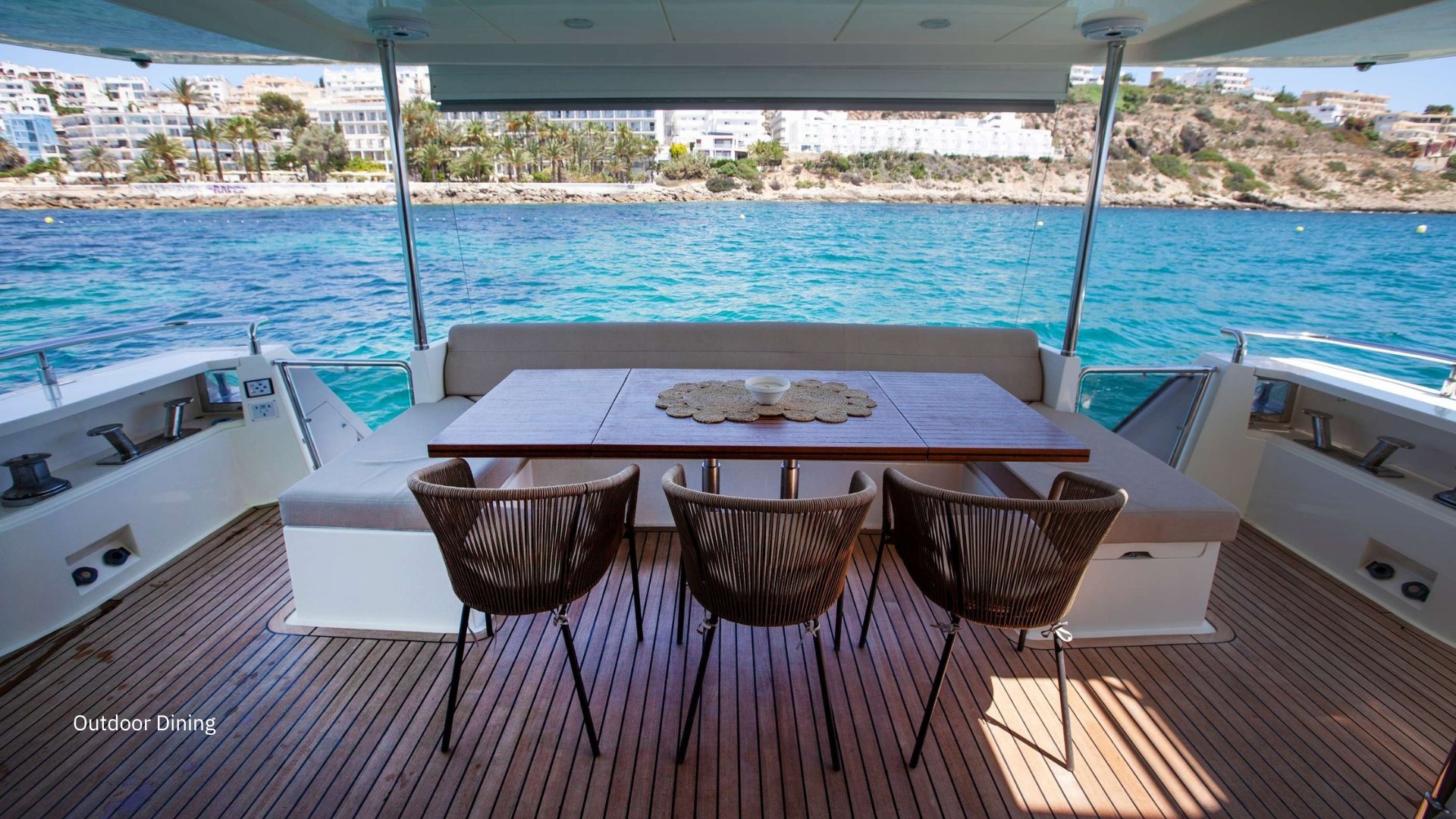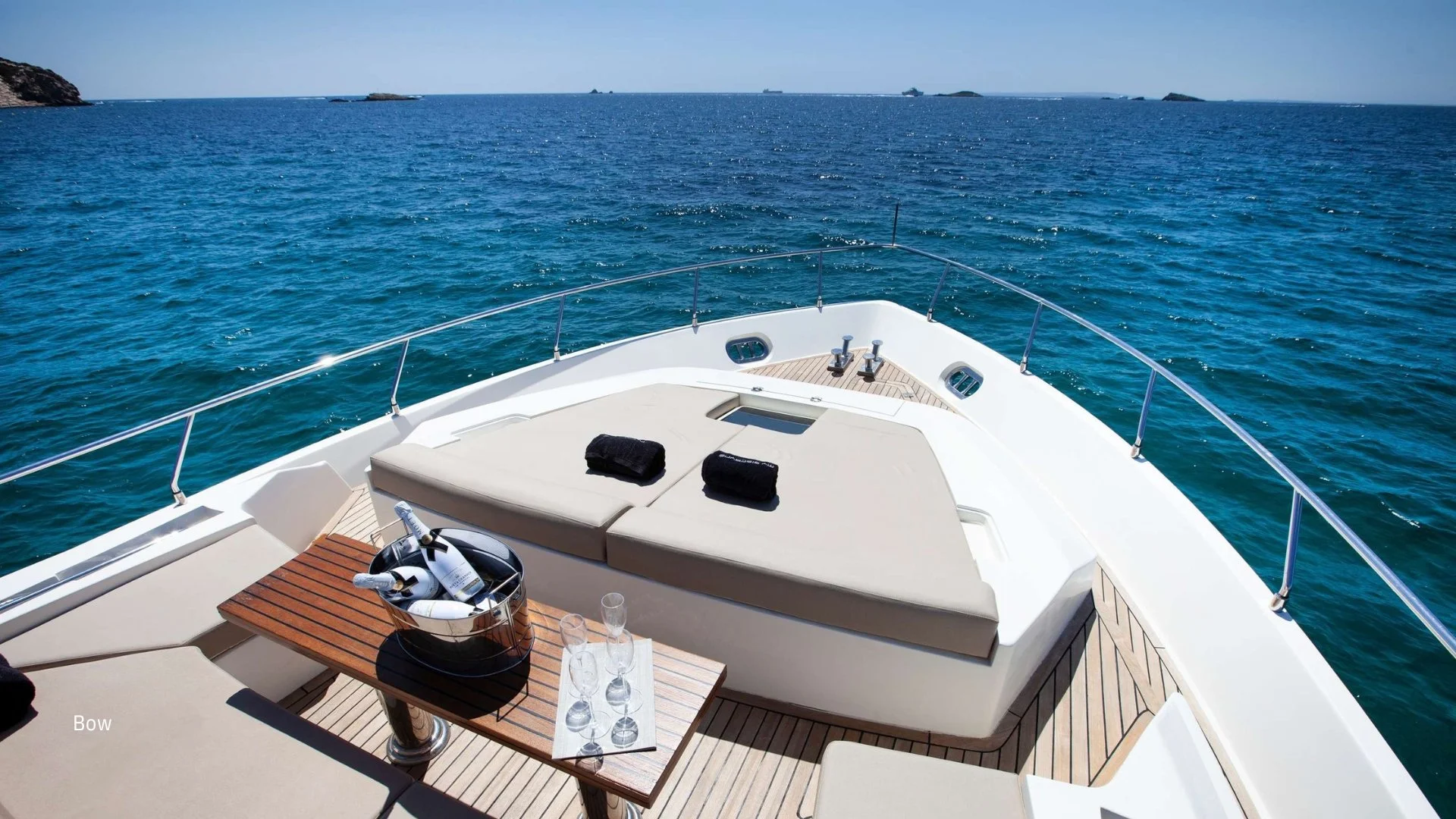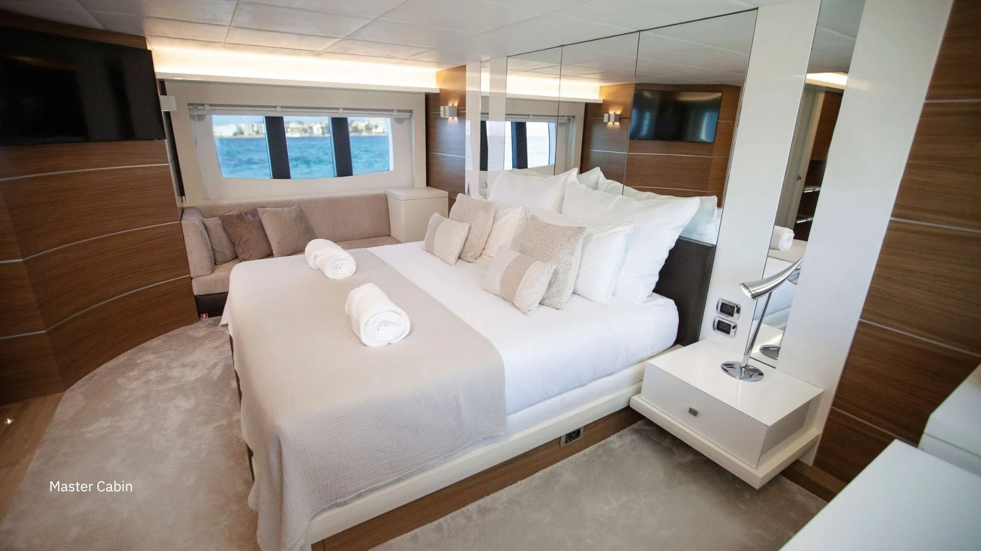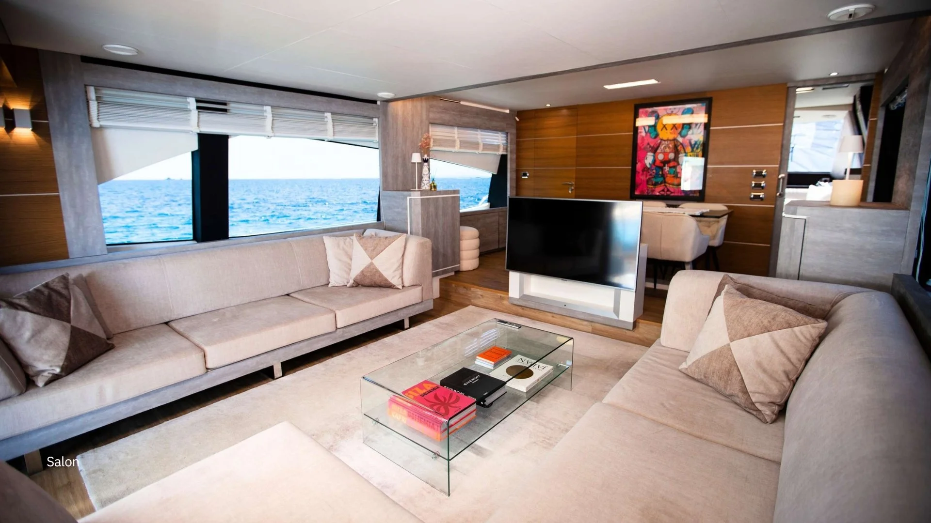 Su interior presenta un diseño luminoso y contemporáneo, con materiales de alta calidad y una distribución muy funcional. Dispone de 4 camarotes para 8 invitados: cabina del armador a toda la manga, un magnífico VIP en proa, un camarote doble y un twin, todos con baño en suite. El salón, amplio y conectado a la zona de comedor, ofrece vistas panorámicas y acceso directo a las áreas exteriores.
