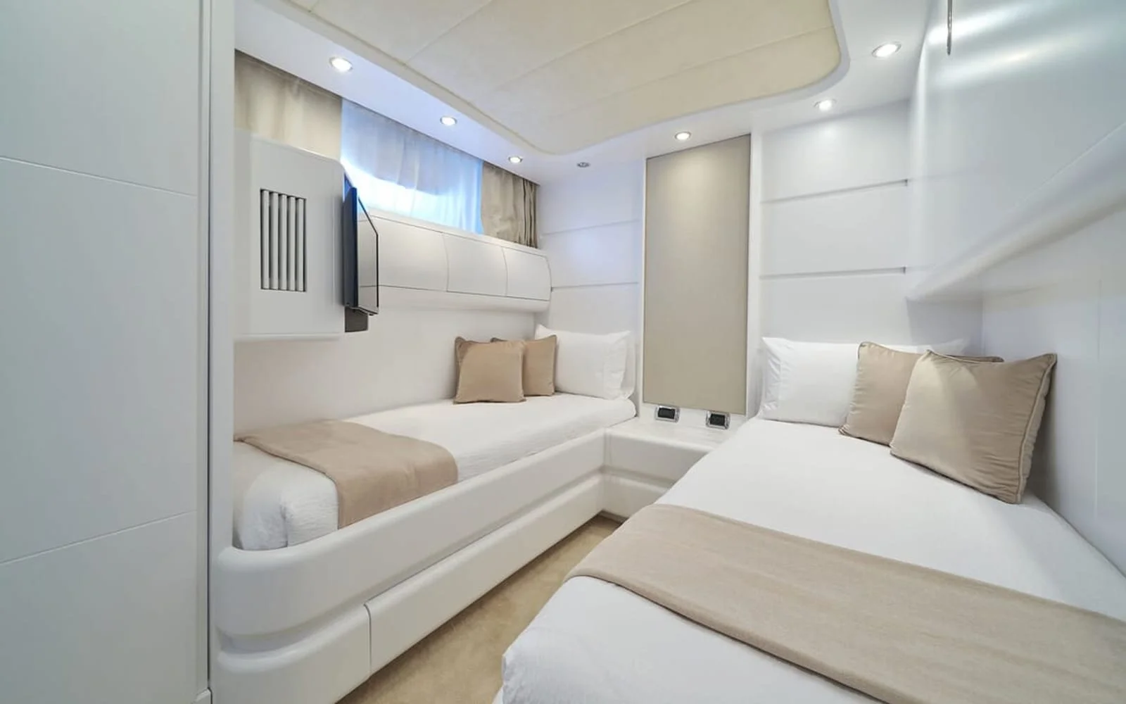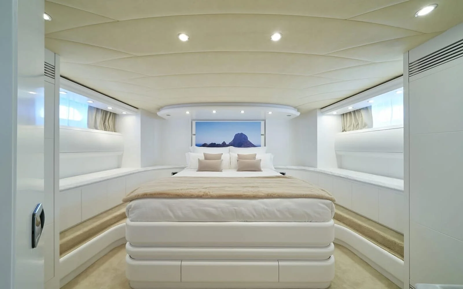 En el interior, los espacios han sido completamente renovados para ofrecer una atmósfera cálida y luminosa. Los acabados en tonos neutros, combinados con materiales de alta calidad, crean un ambiente elegante y acogedor. Alojamiento para diez invitados en cuatro camarotes: una suite principal, una cabina VIP y dos twin con literas Pullman, todas con baño en suite y diseñadas para el máximo confort.