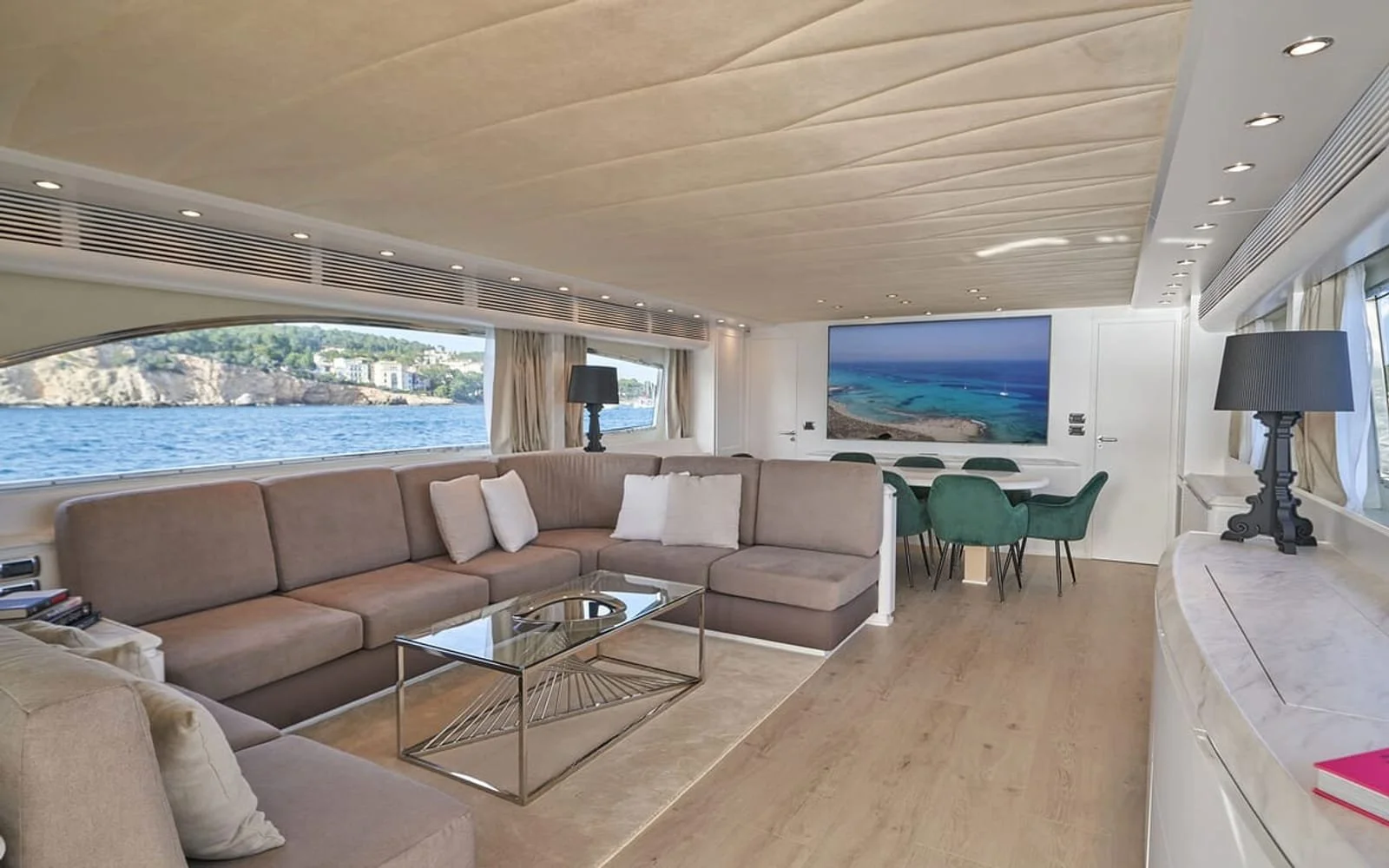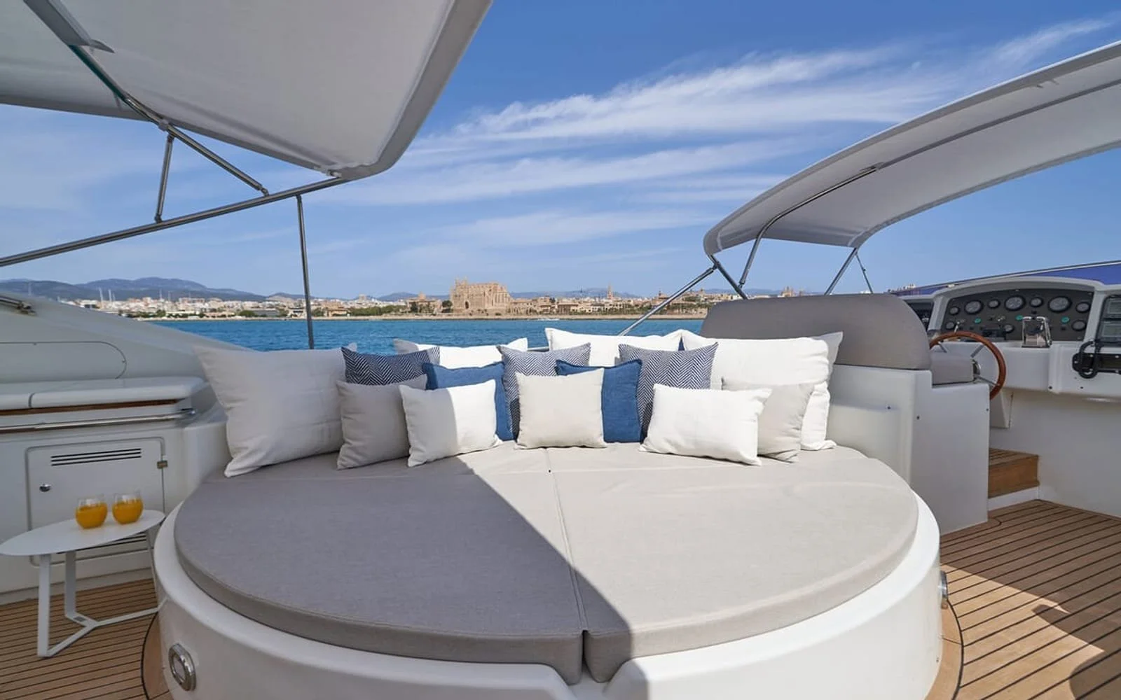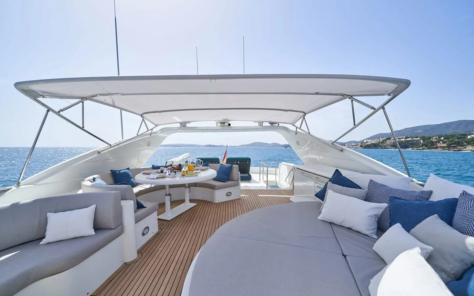 El flybridge es uno de sus grandes atractivos, con un extenso solárium, zona de comedor y un wet bar completamente equipado con barbacoa, perfecto para largas jornadas al aire libre o cenas bajo las estrellas. La cubierta de proa ofrece un espacio íntimo para tomar el sol y relajarse, mientras que la popa dispone de un comedor exterior protegido para comidas junto al mar.
