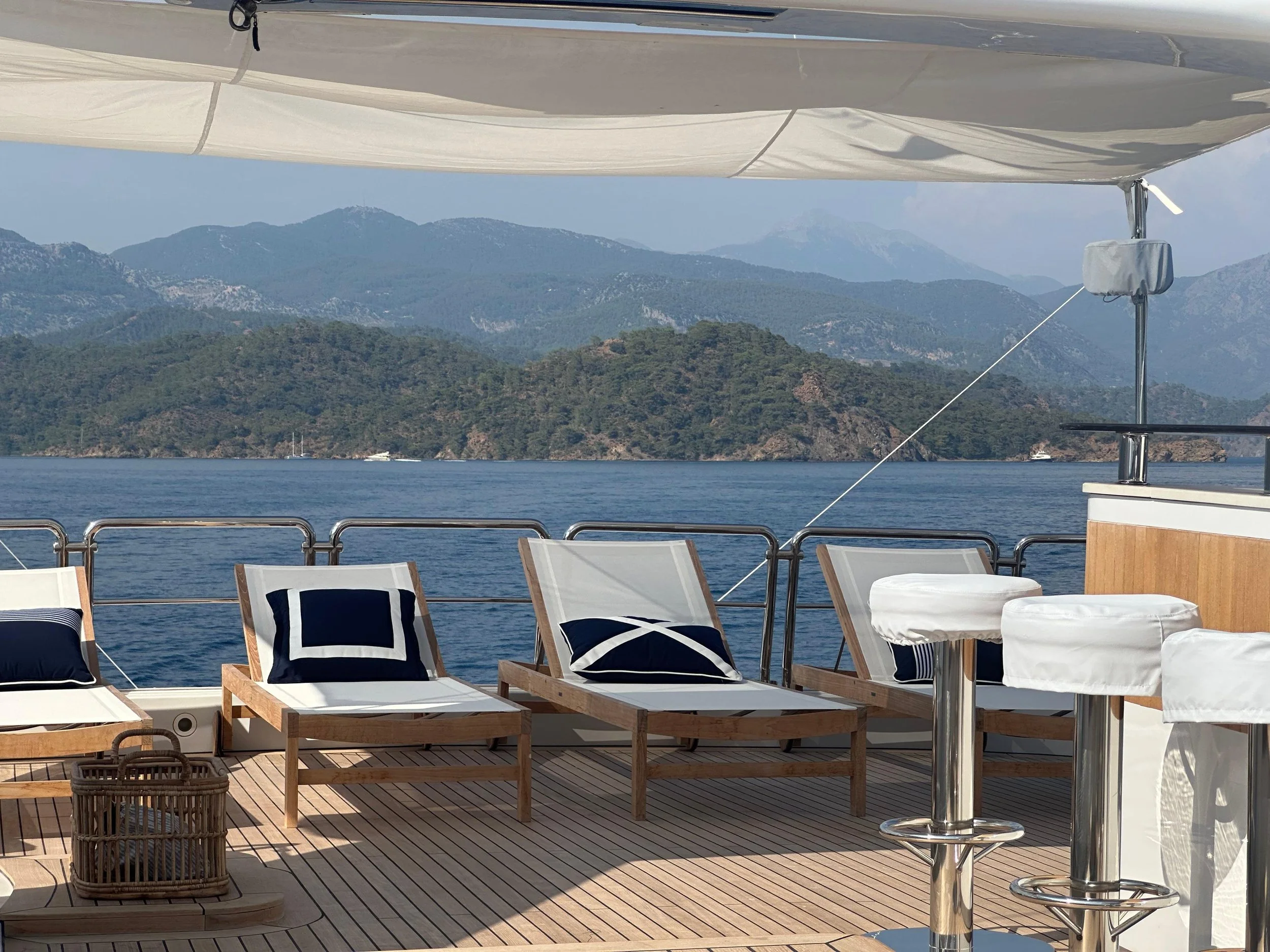 El exterior ofrece amplias zonas de descanso y solárium, tanto en proa como en popa, además de un jacuzzi en cubierta y múltiples espacios al aire libre para disfrutar de una jornada relajada o una comida frente al mar. La distribución está pensada para maximizar la comodidad de los invitados, con un flujo natural entre las áreas interiores y exteriores.