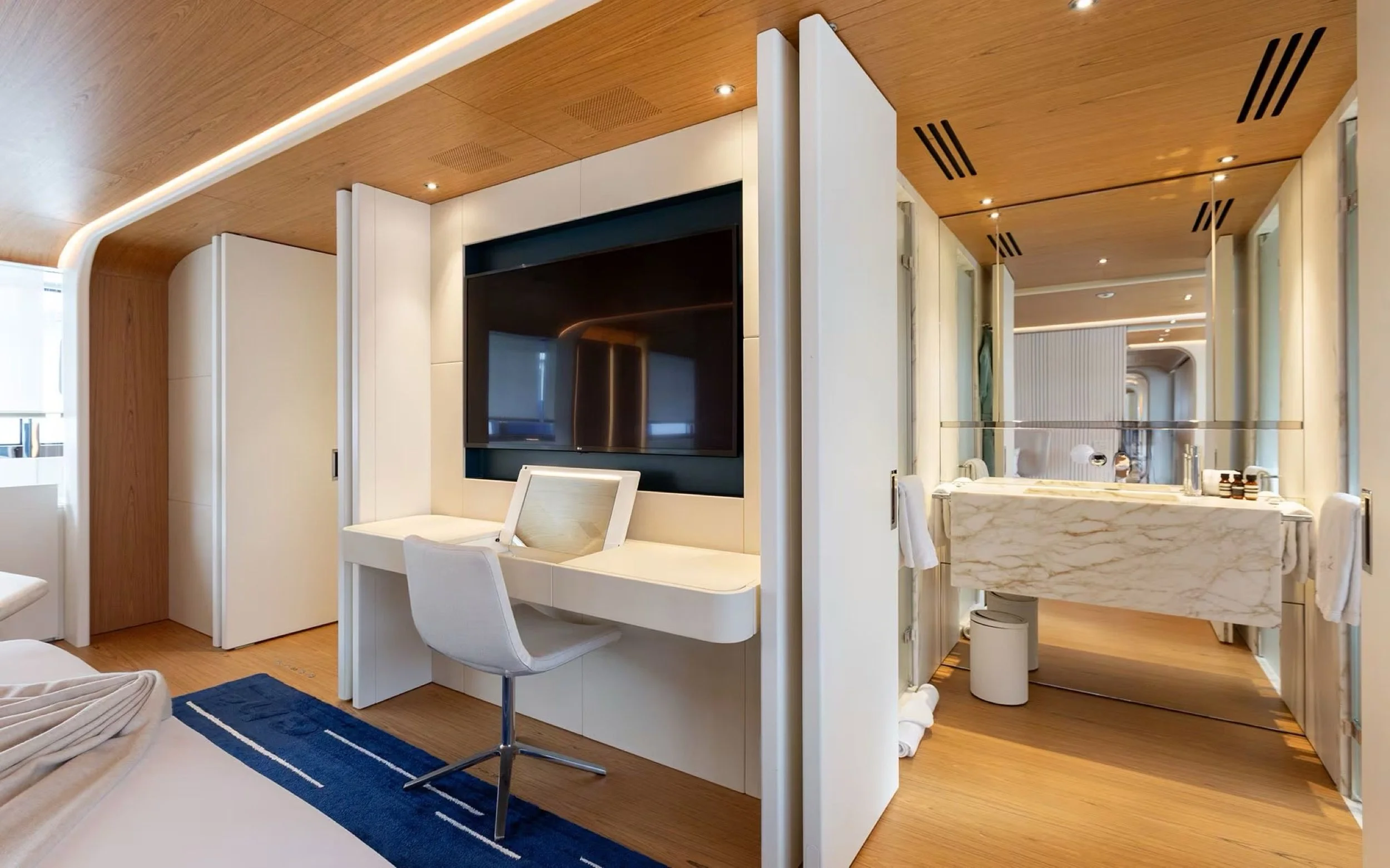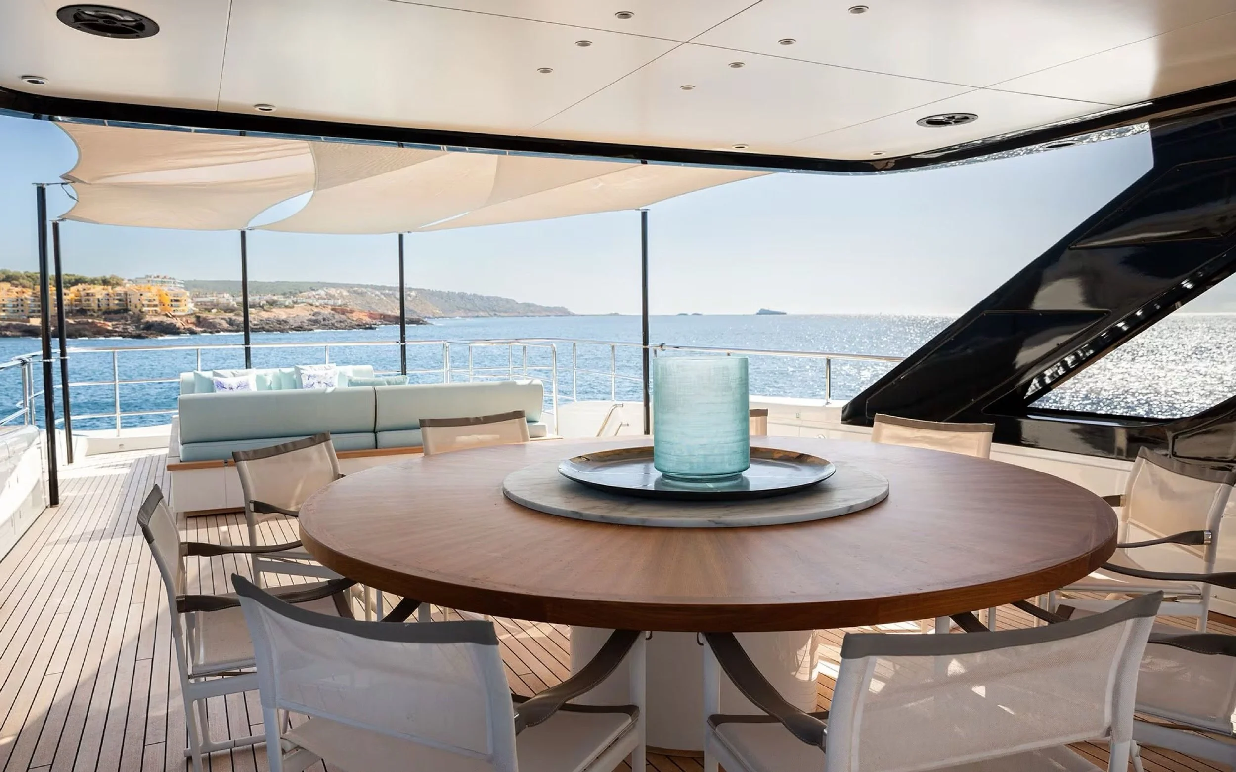 Con cinco camarotes amplios, incluyendo una suite principal en cubierta y cuatro cabinas dobles en planta inferior, este yate ofrece alojamiento de primer nivel para hasta diez huéspedes. Los espacios exteriores destacan por su gran plataforma de baño, club de playa, soláriums amplios y zonas de relax, ideales para disfrutar del mar con total privacidad.