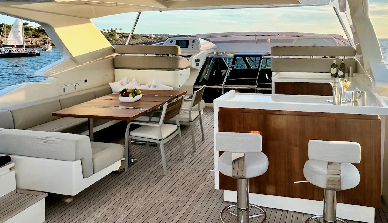 En el exterior se aprecian espacios amplios para la relajación y la convivencia: una terraza con jacuzzi, un wet bar en la cubierta superior y una plataforma hidráulica que transforma la popa en un salón de playa, facilitando el acceso directo al agua.