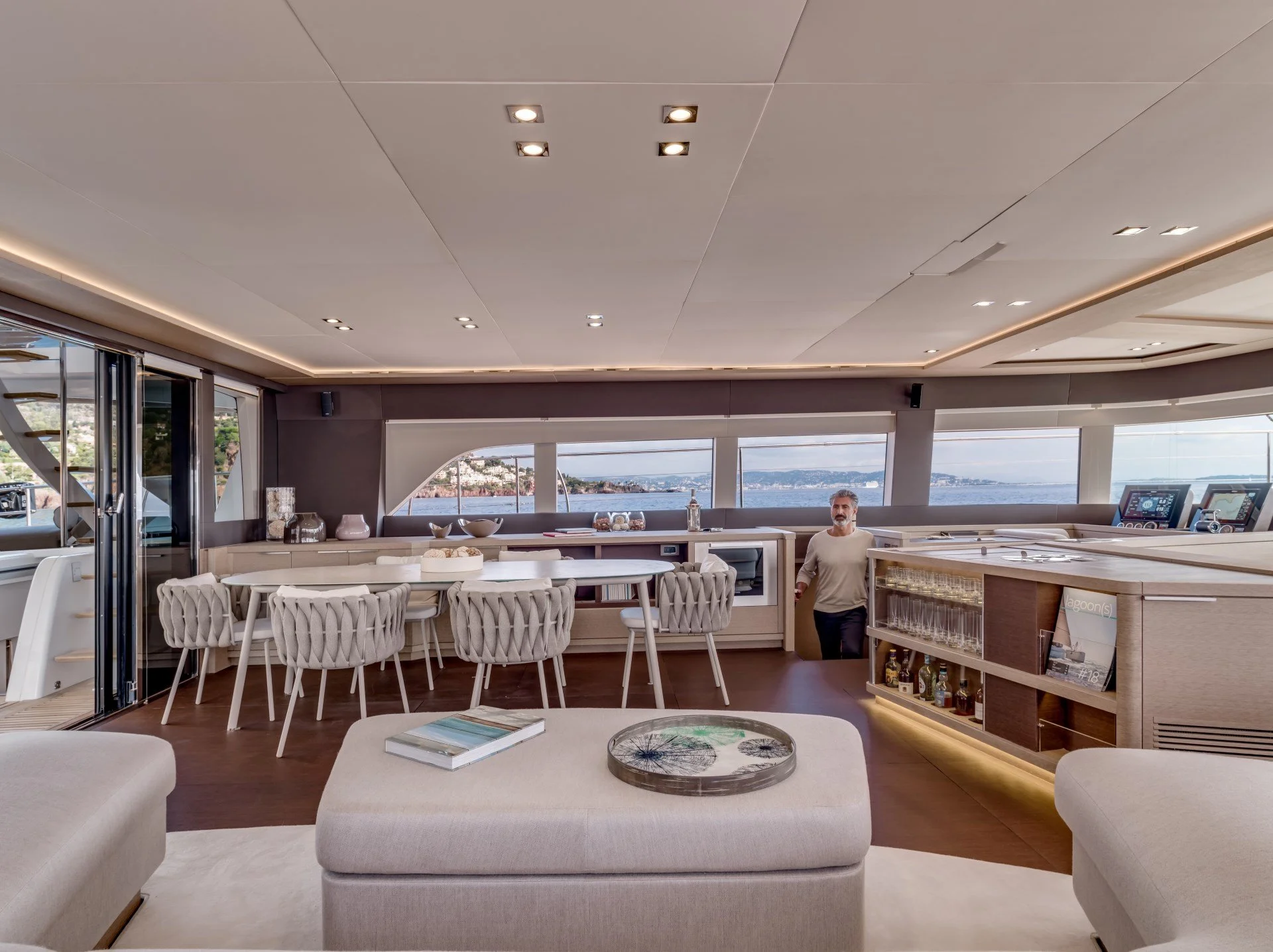 En las cubiertas exteriores se encuentran amplias zonas de solárium, un comedor al aire libre y áreas lounge que invitan a socializar o relajarse al atardecer. El interior, cuidadosamente decorado, conecta visualmente con el entorno mediante ventanales que llenan de luz los espacios comunes.