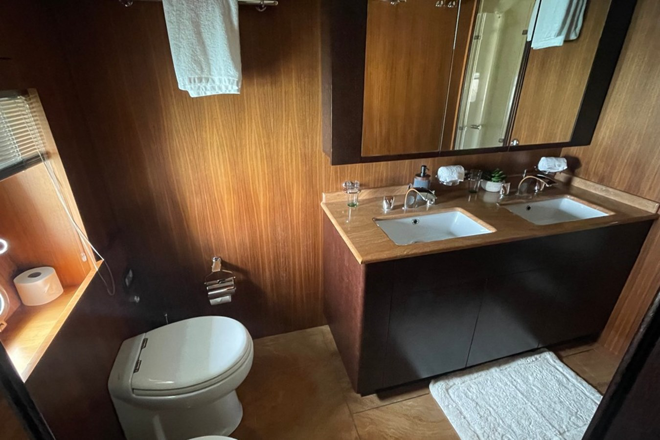 Su distribución interior ofrece cuatro cabinas para ocho invitados, todas con baño en suite, junto a un salón principal de líneas limpias y grandes ventanales que inundan de luz natural el espacio. Los exteriores proporcionan amplias zonas para el ocio, incluyendo soláriums, jacuzzi y comedor al aire libre, ideales para la vida social a bordo.