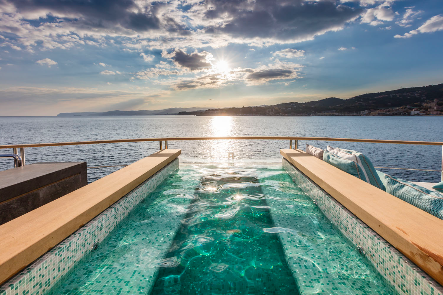 El diseño exterior refleja las líneas distintivas del astillero Mondomarine, mientras que el interior destaca por la calidad de sus materiales, la luminosidad de los espacios y un estilo contemporáneo que transmite sofisticación y confort. Las cubiertas exteriores ofrecen amplias zonas de descanso, solárium y comedor al aire libre, pensadas para el entretenimiento y la vida social a bordo.