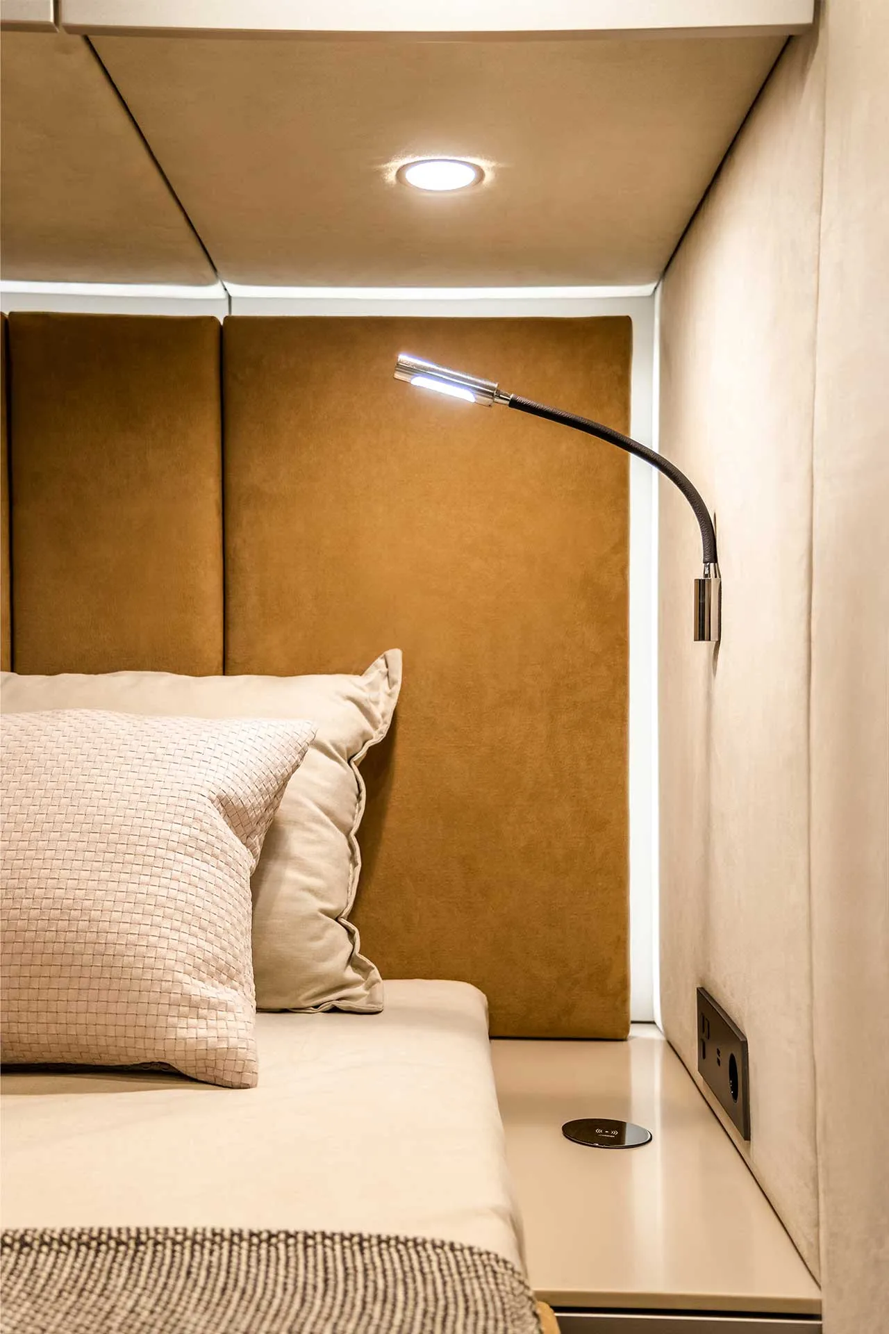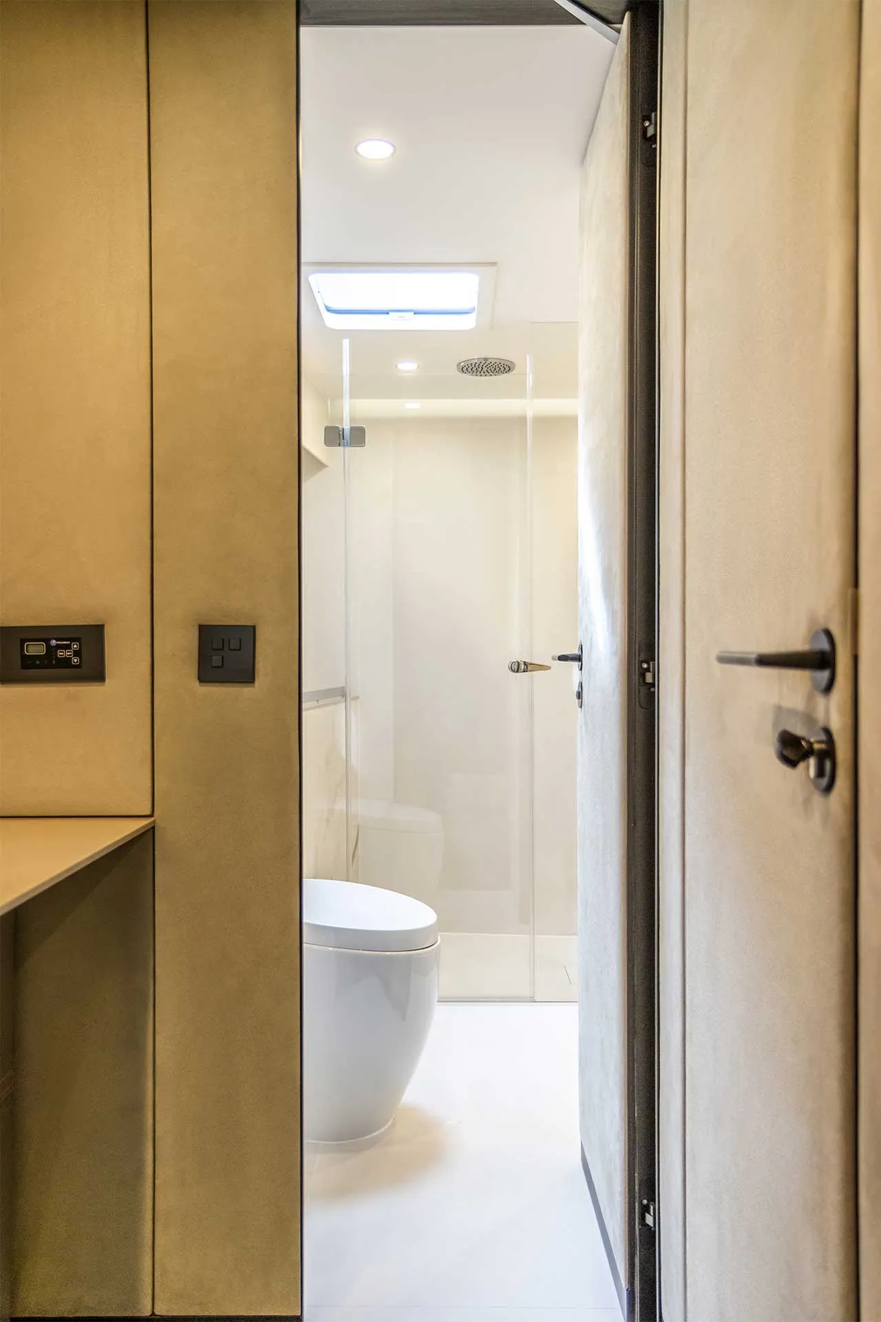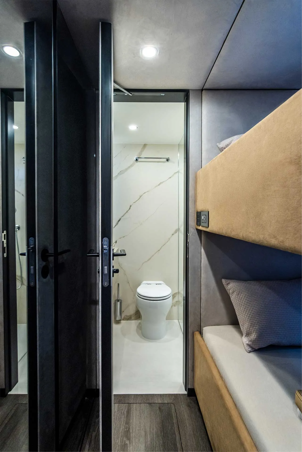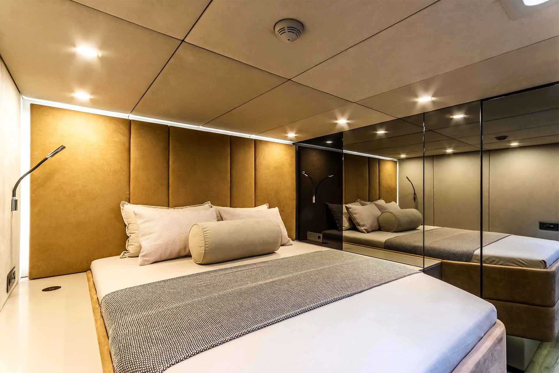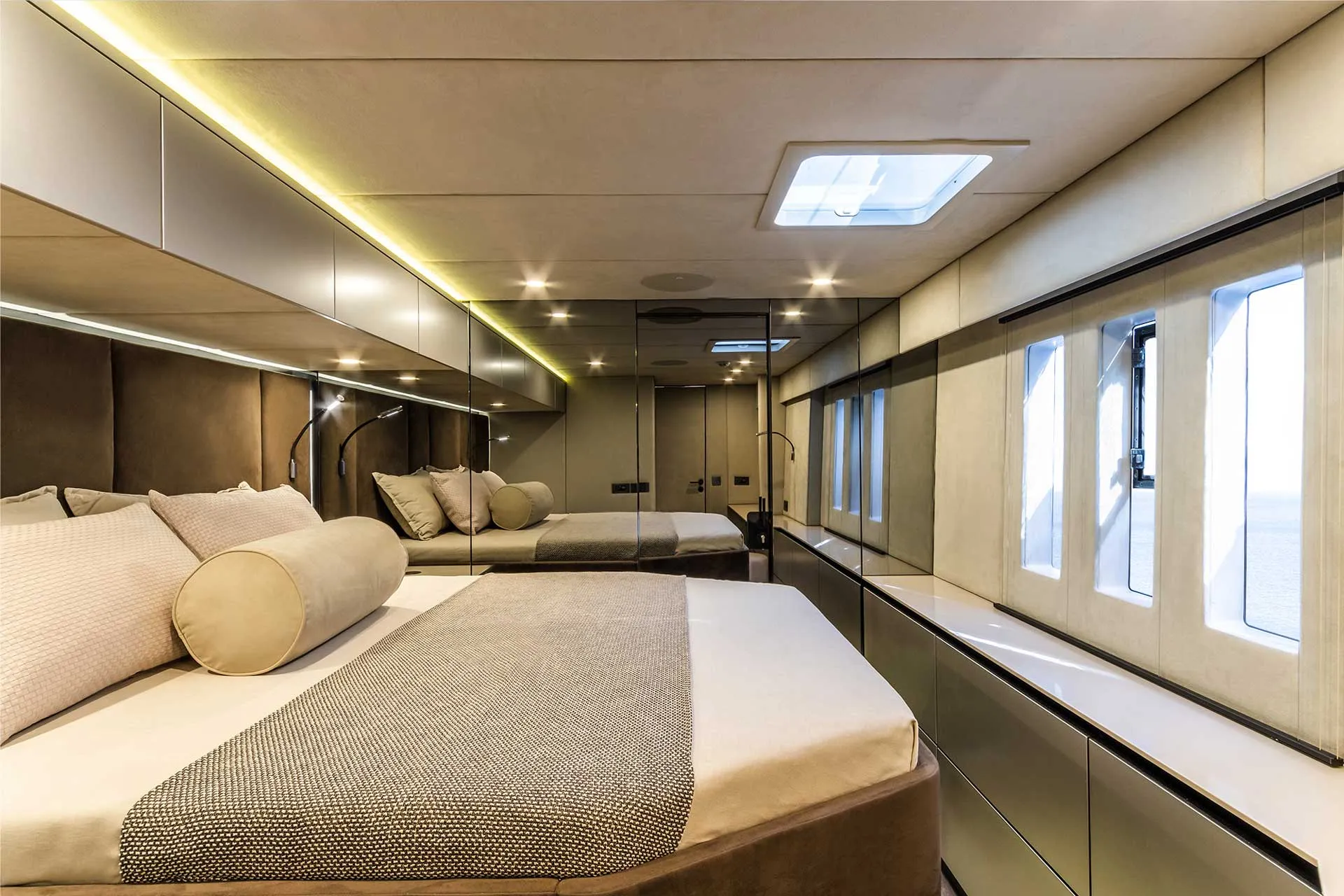 El interior está concebido para ofrecer confort en cada detalle: grandes ventanales, materiales de alta calidad y una distribución optimizada. Los cuatro camarotes —una “king suite” y tres cabinas “queen” con baño en suite— permiten alojar cómodamente a ocho invitados.