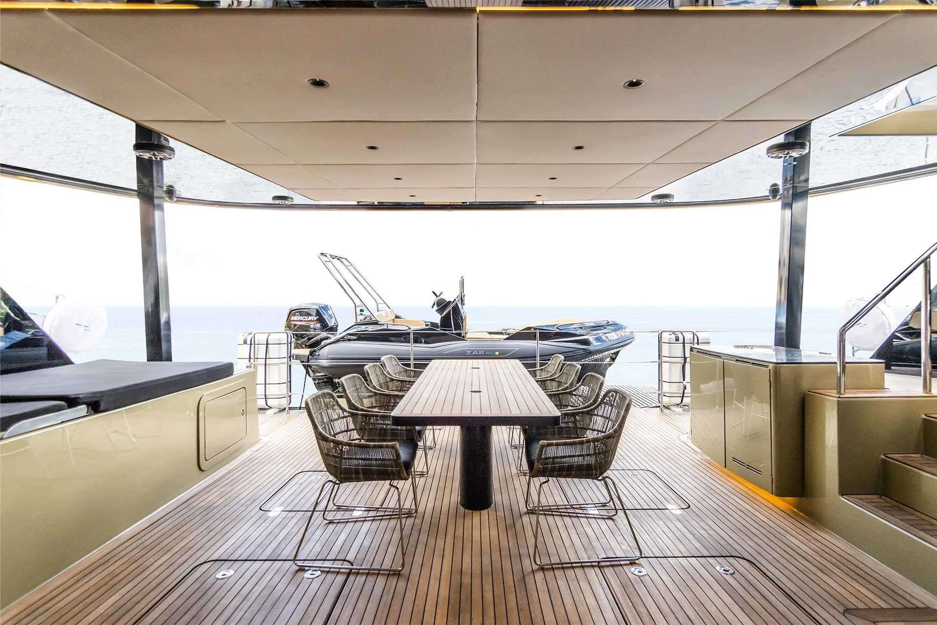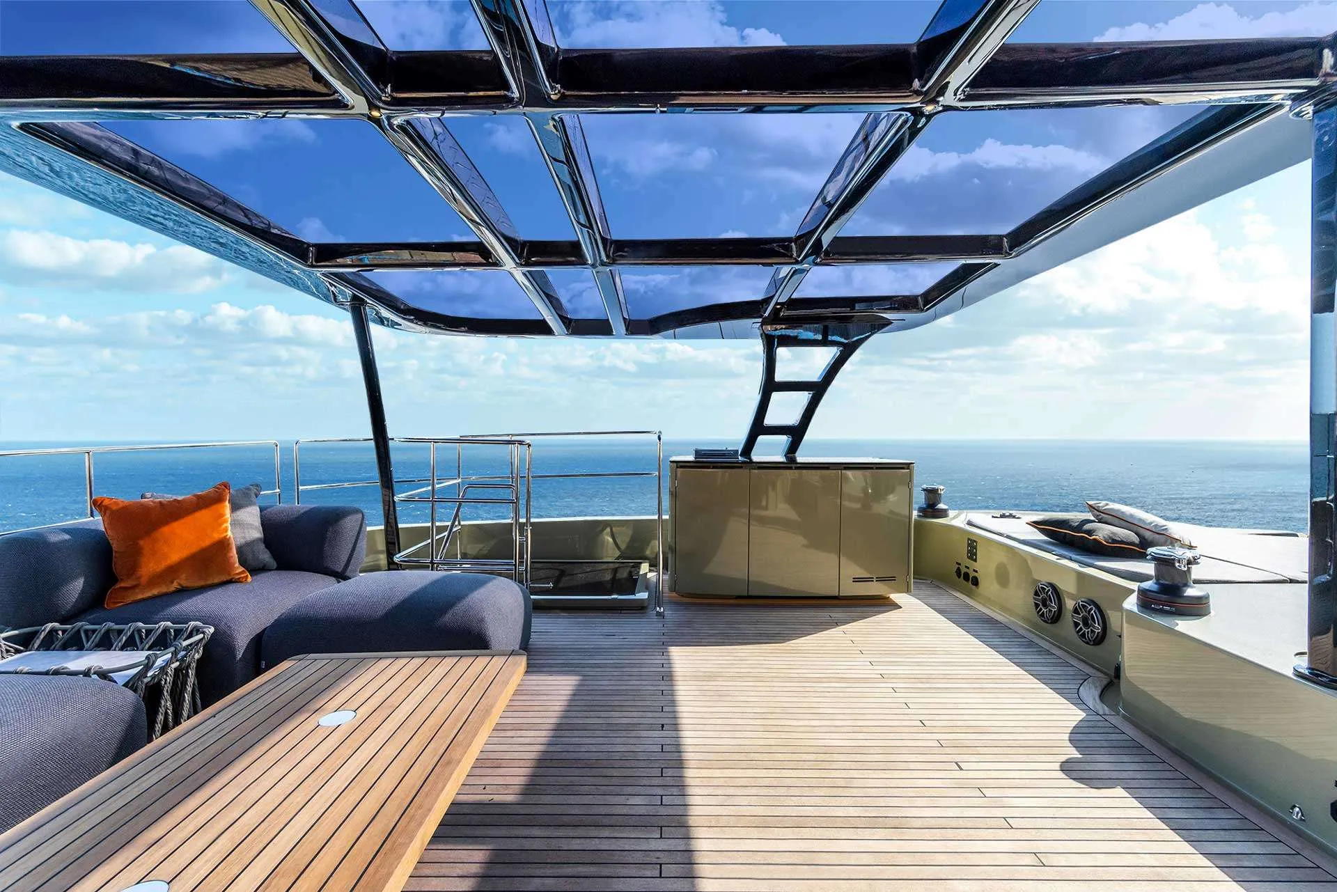 En cubierta, destacan zonas de solárium, una amplia plataforma de baño y comedores al aire libre que permiten disfrutar del entorno marino desde múltiples perspectivas.