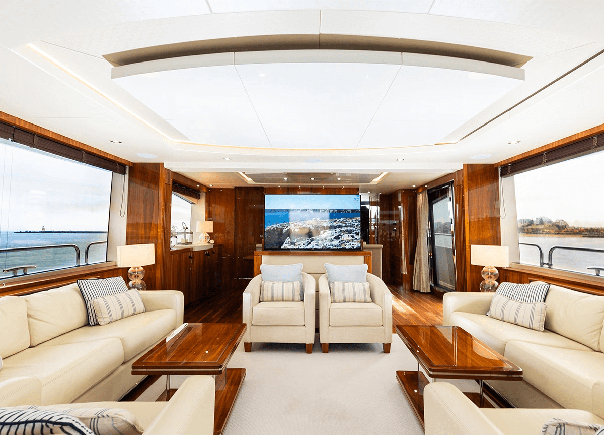 El interior, contemporáneo y elegante, destaca por su luminosidad y el uso de materiales de alta calidad. El salón principal ofrece un ambiente abierto con comedor integrado y ventanales de suelo a techo que conectan visualmente con el mar. La distribución incluye cuatro camarotes con baño en suite: una suite principal a toda manga, una cabina VIP y dos twins convertibles en dobles, ofreciendo alojamiento para ocho invitados en pernocta y hasta diez durante el día.