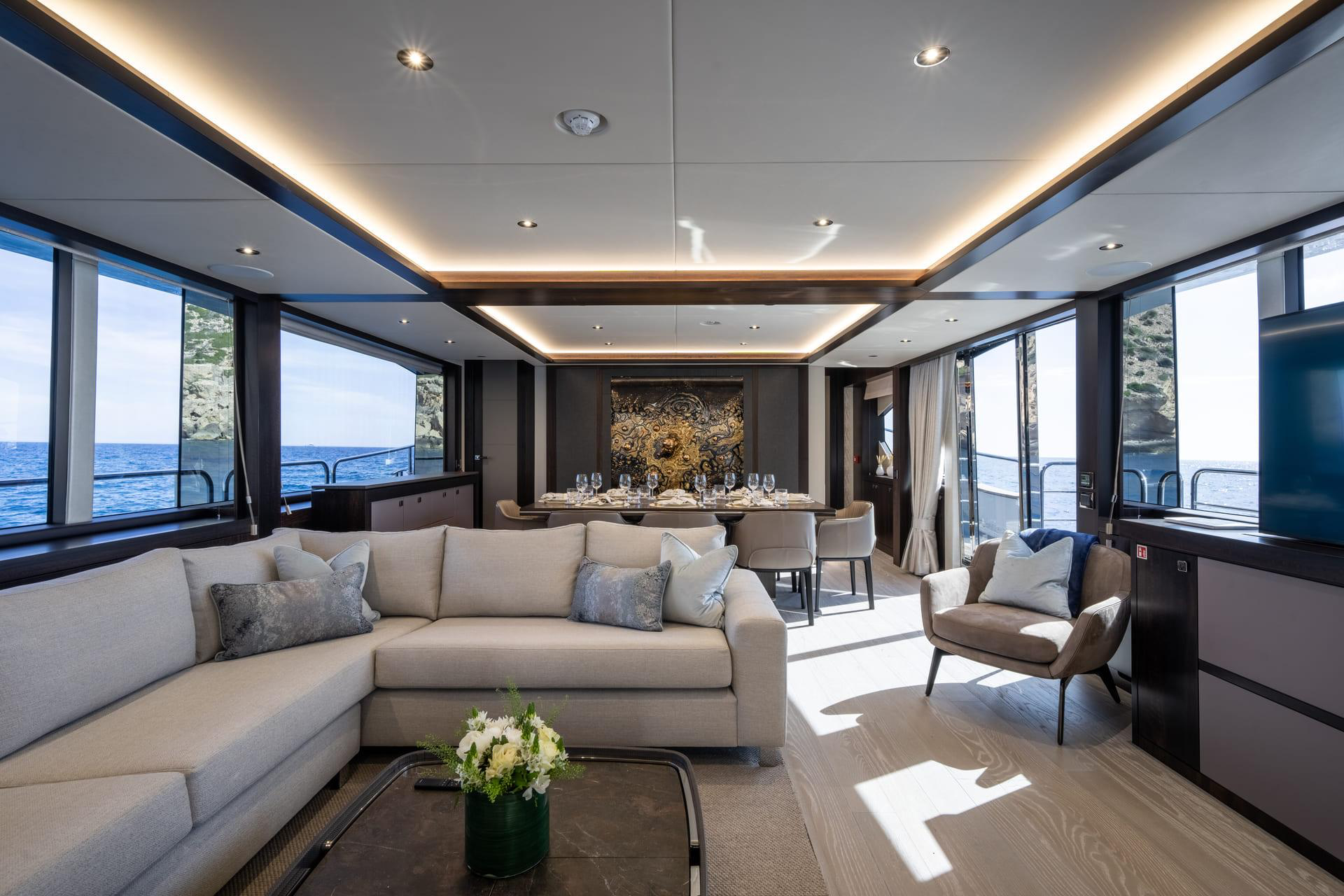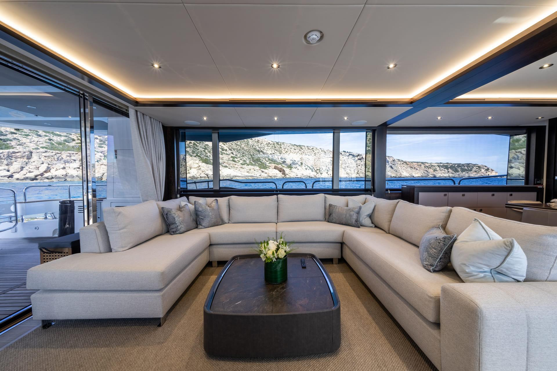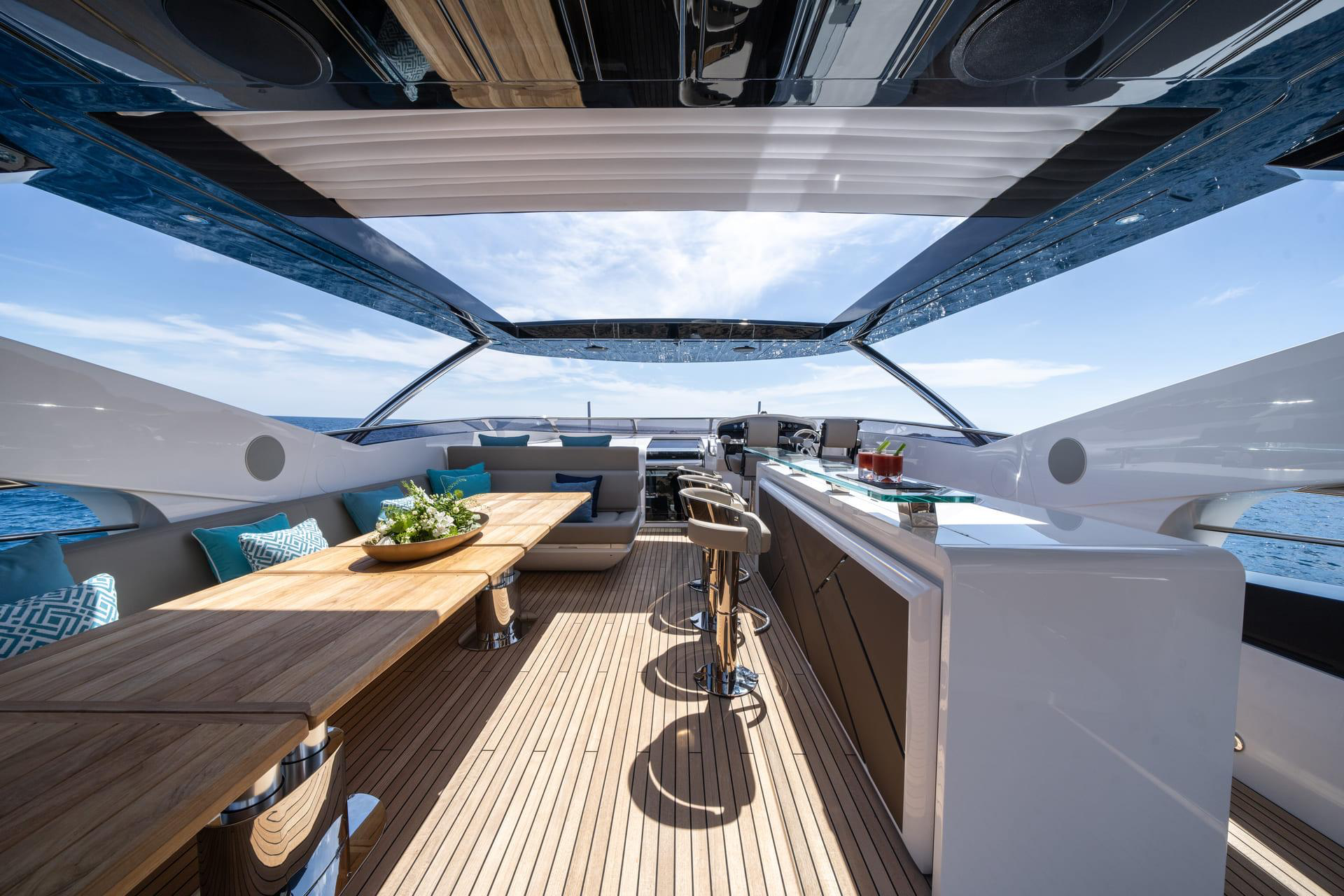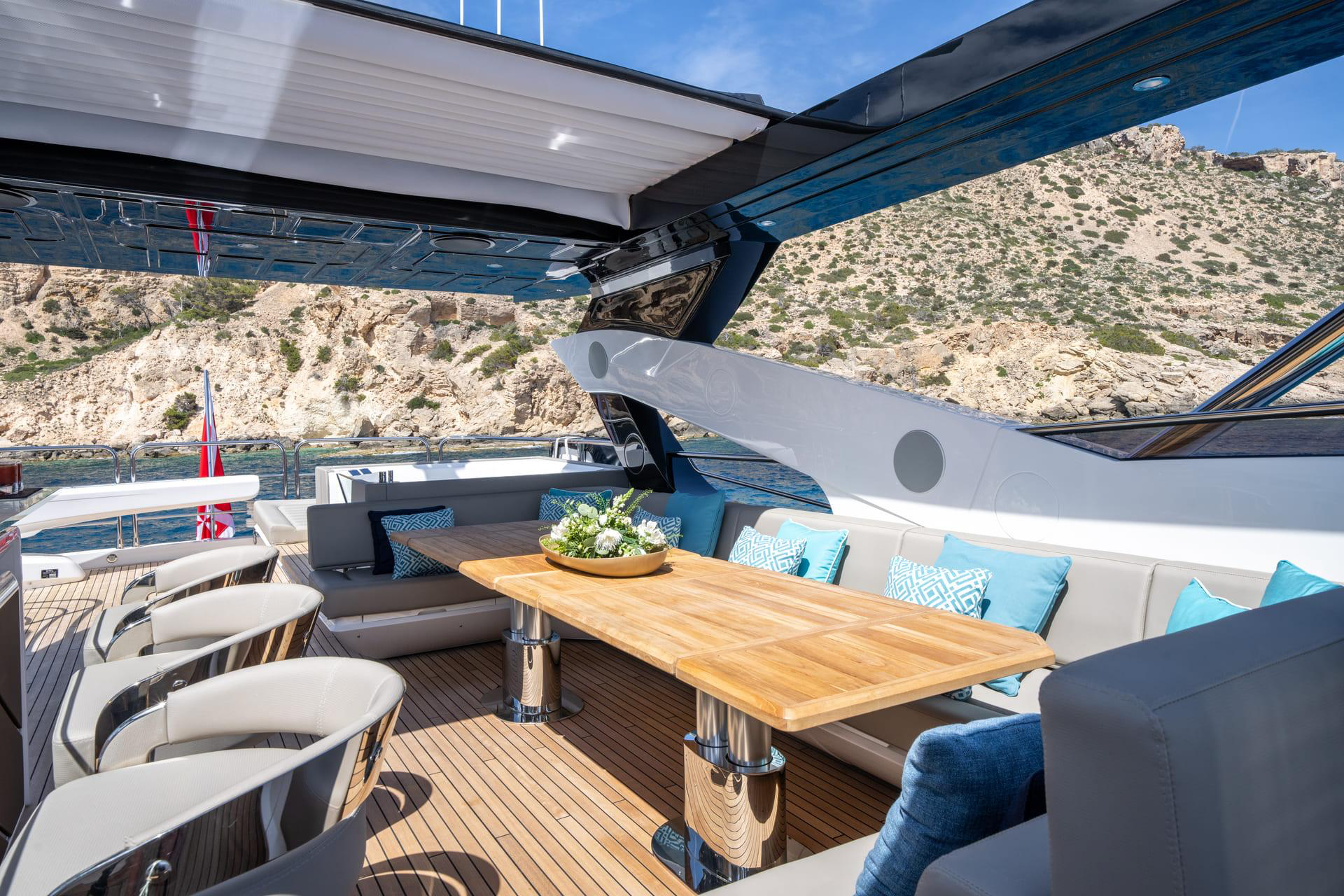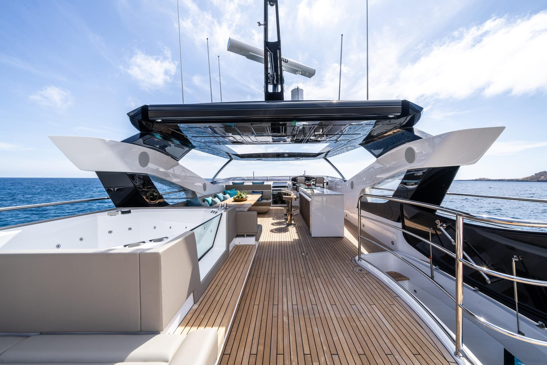 Su diseño exterior, firmado por Mulder Design, presenta líneas fluidas y una silueta imponente que transmite deportividad y equilibrio. El flybridge es uno de sus espacios más exclusivos: equipado con jacuzzi cuadrado, bar exterior con BBQ, zona de comedor para 12 invitados, asientos calefactados y un ambiente adaptable tanto para el relax como para eventos sociales.