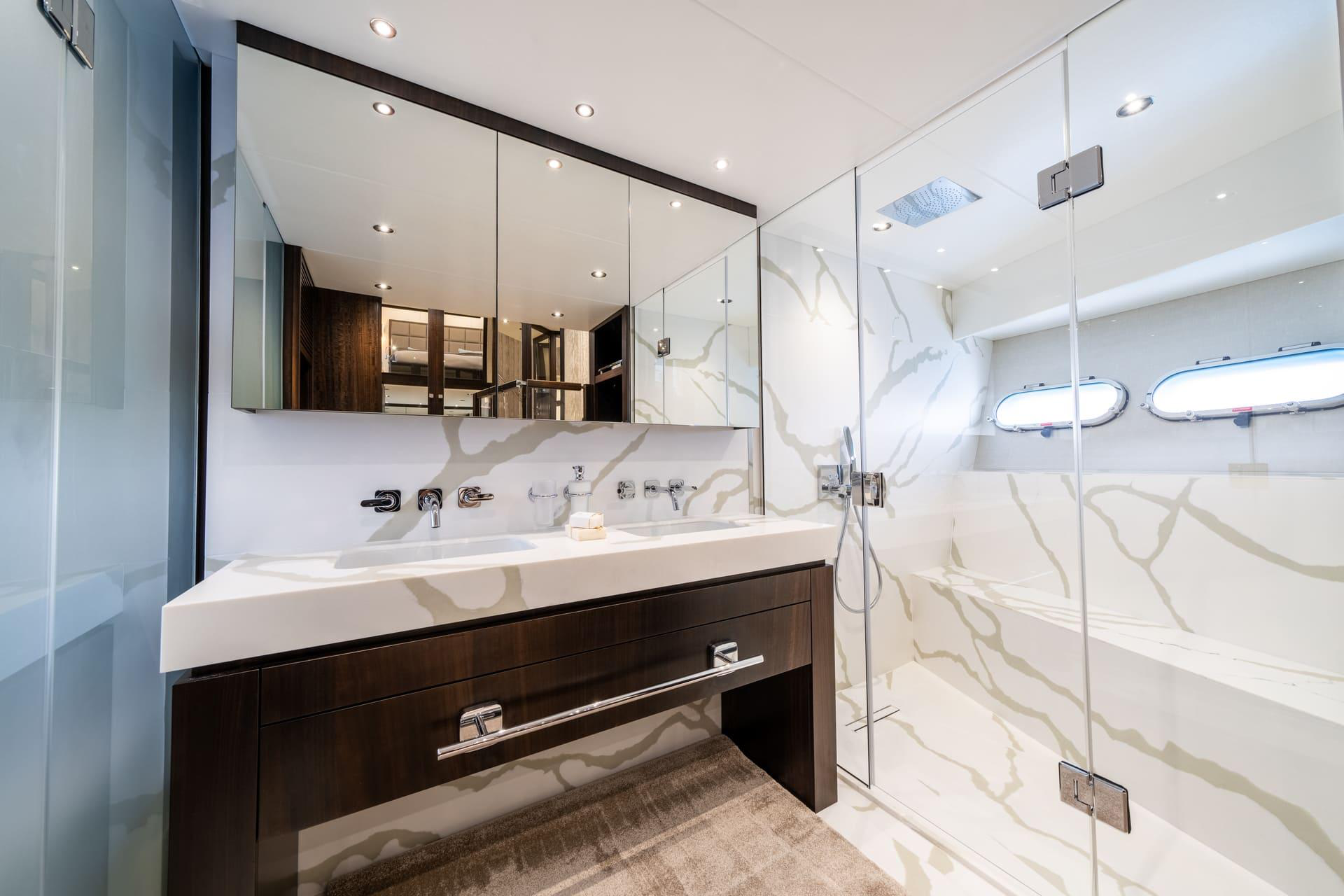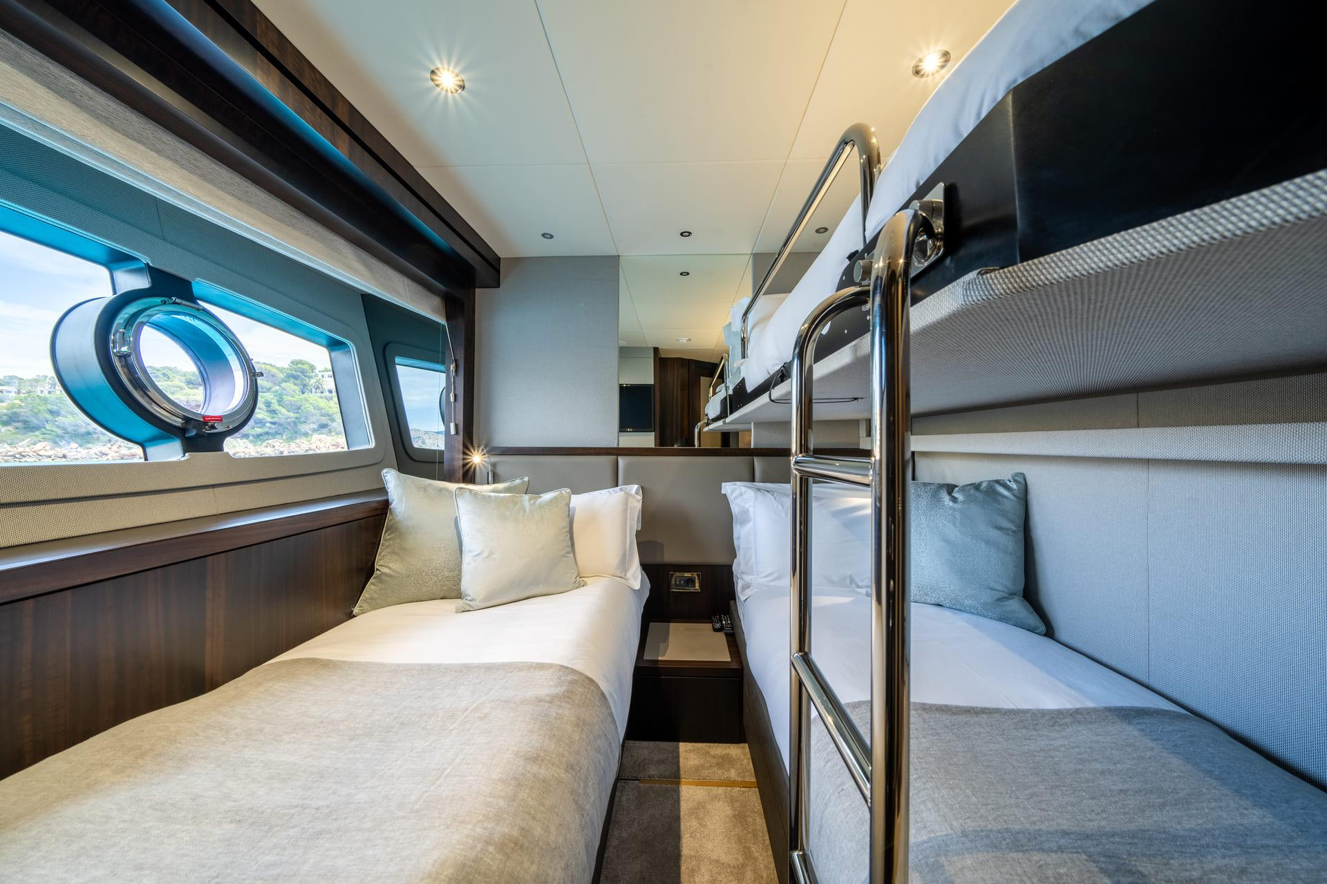 El alojamiento para doce invitados se completa con dos camarotes VIP a toda manga y dos twin convertibles en dobles, todos con baño en suite. Cada cabina está equipada con los sistemas de entretenimiento más avanzados, incluyendo Starlink, Apple TV, Netflix, Amazon Prime y Sonos, además de un sistema de climatización individual y persianas eléctricas.