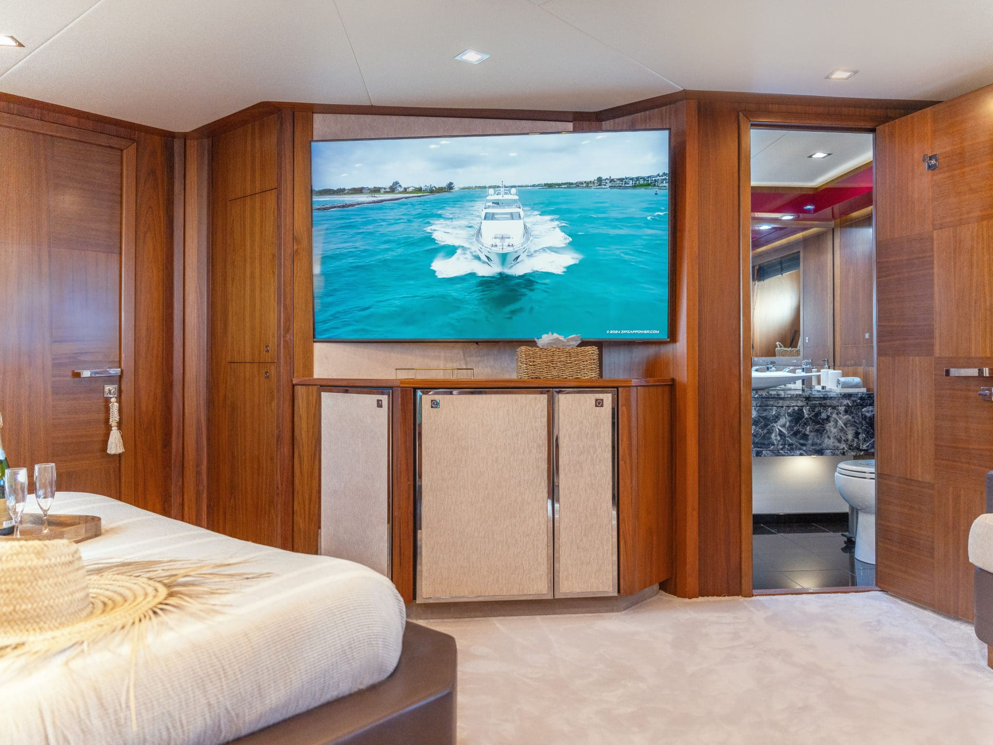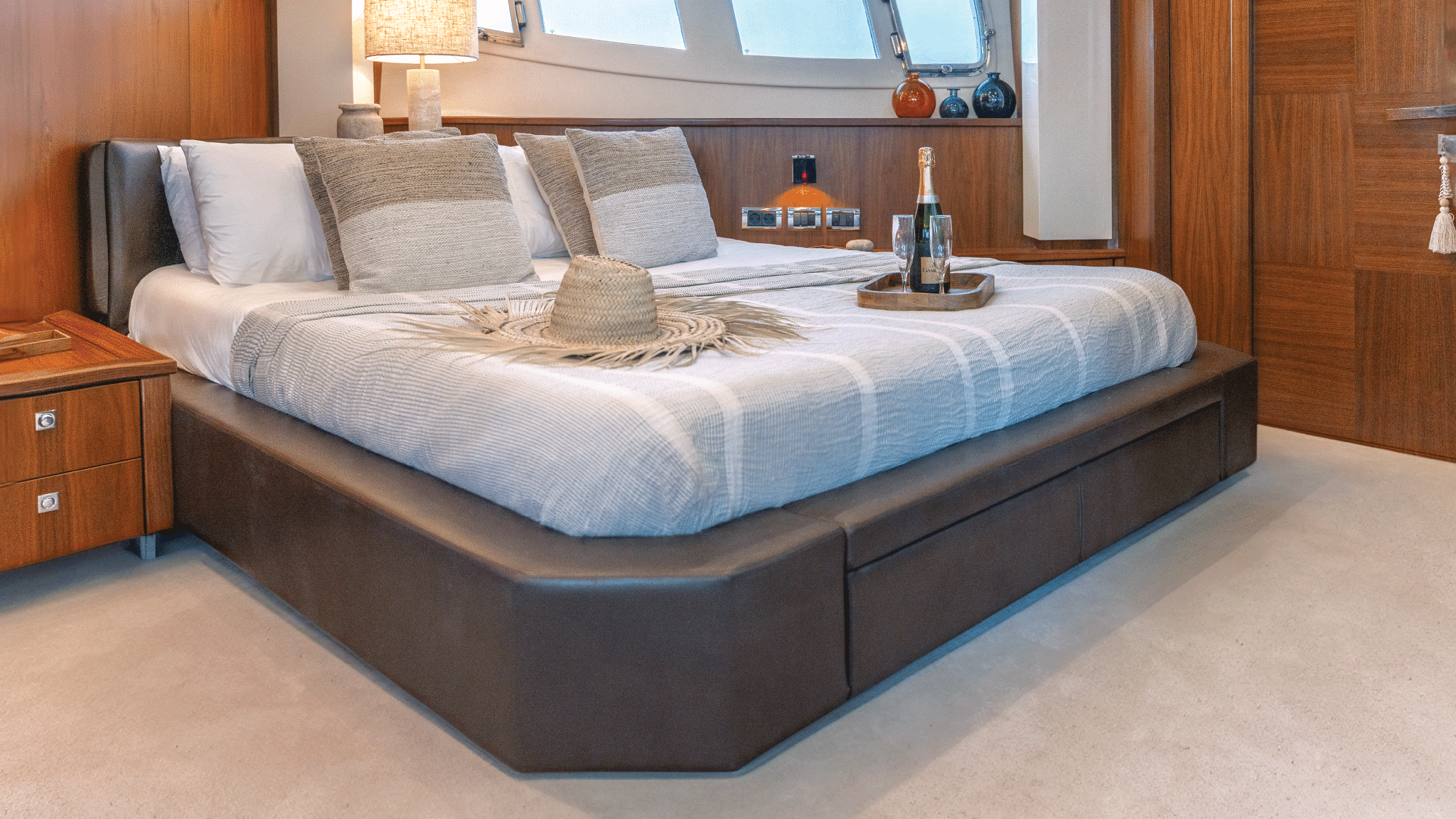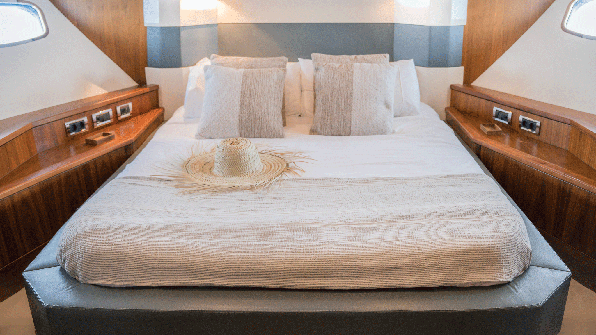El interior presenta un estilo moderno y funcional, con acabados de alta calidad y una distribución inteligente. Los amplios ventanales aportan luz natural, y los cuatro camarotes con baño privado —una suite principal, una cabina VIP y dos twin con Pullman— ofrecen alojamiento para hasta ocho invitados en pernocta, manteniendo la privacidad y el confort de un yate de categoría superior.