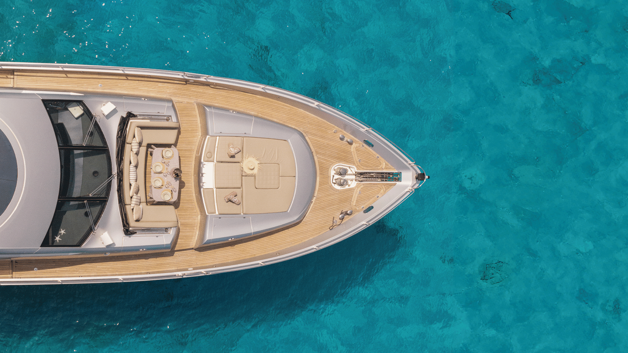 Su perfil aerodinámico y su amplia cubierta exterior están pensados para el disfrute al aire libre. La zona de proa ofrece un gran solárium para relajarse al sol, mientras que la popa cuenta con un comedor exterior ideal para comidas junto al mar. En la parte superior, el flybridge integra tumbonas, área lounge y toldo retráctil, ofreciendo un espacio versátil tanto para tomar el sol como para disfrutar de una copa al atardecer.