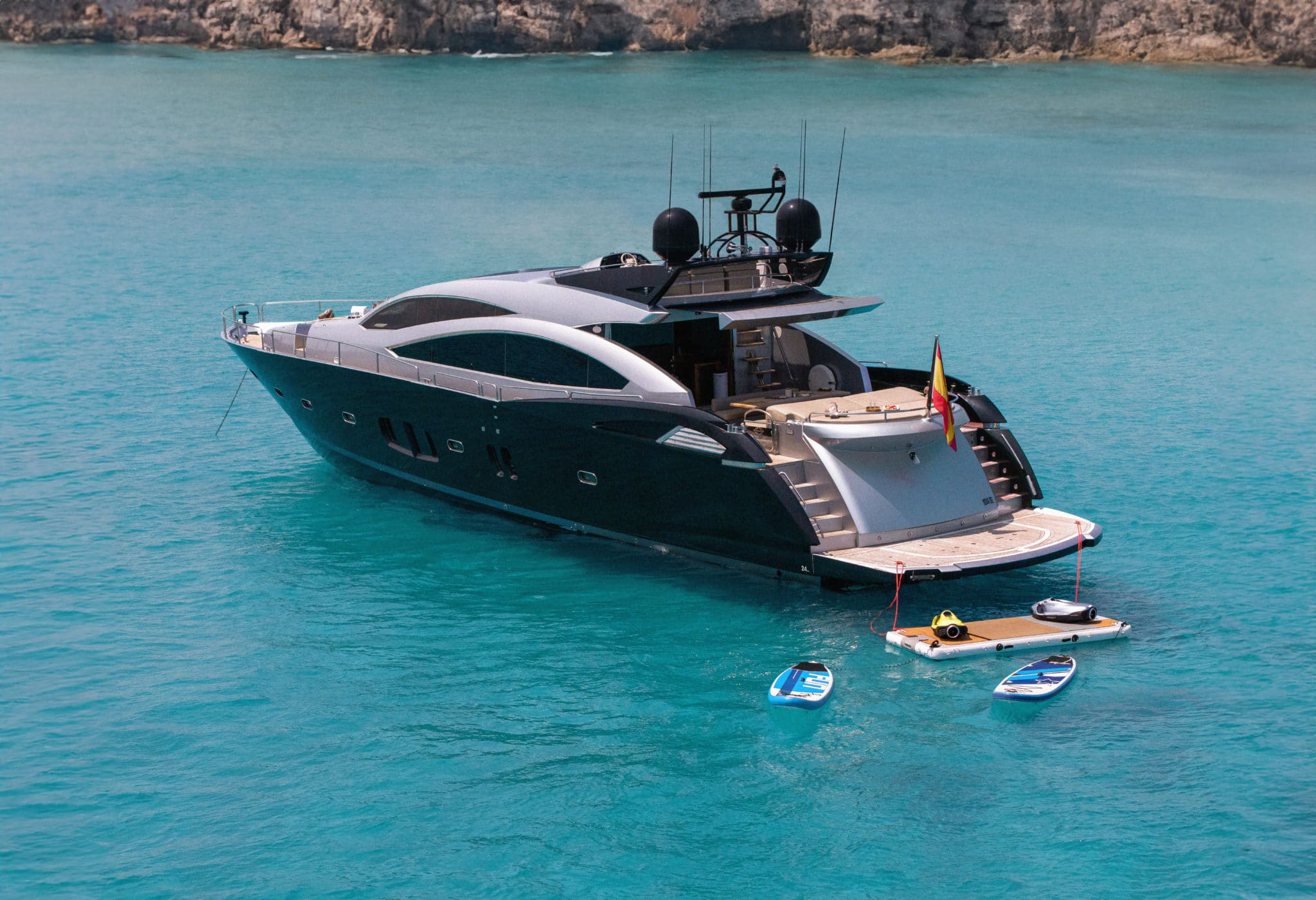 A bordo, los invitados disponen de todas las comodidades: aire acondicionado, sistema de sonido interior y exterior, cocina totalmente equipada y amplias zonas de estar. Además, incluye una completa selección de toys náuticos, como moto de agua, paddle boards, plataforma inflable y equipo de snorkel, perfectos para un día de diversión en el mar.