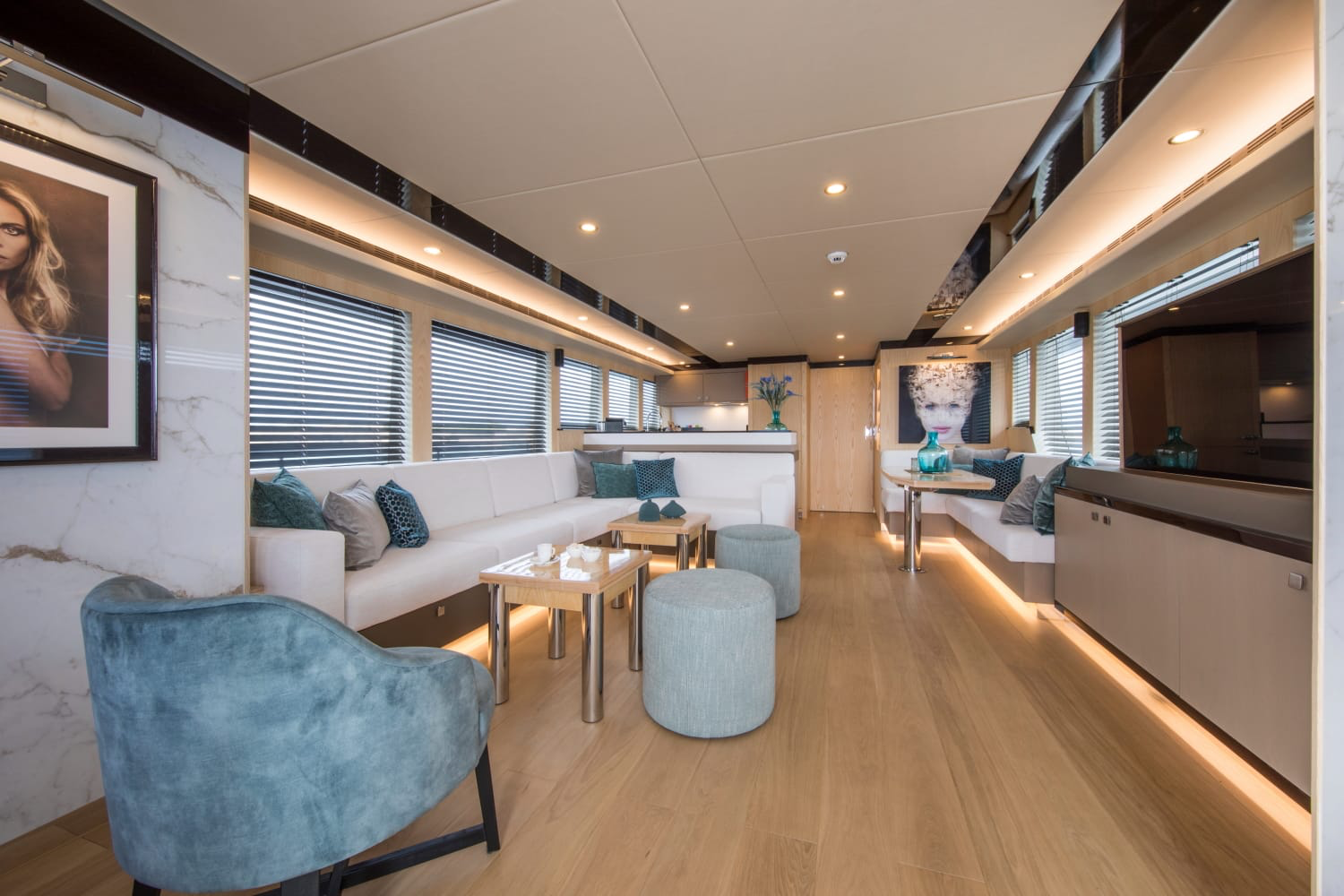 En el interior, la decoración combina tonos claros, líneas limpias y materiales de alta calidad. La distribución incluye una suite principal, una cabina VIP, una twin convertible en doble con litera Pullman y una cabina con literas, con capacidad para nueve invitados en pernocta y hasta doce durante el día.